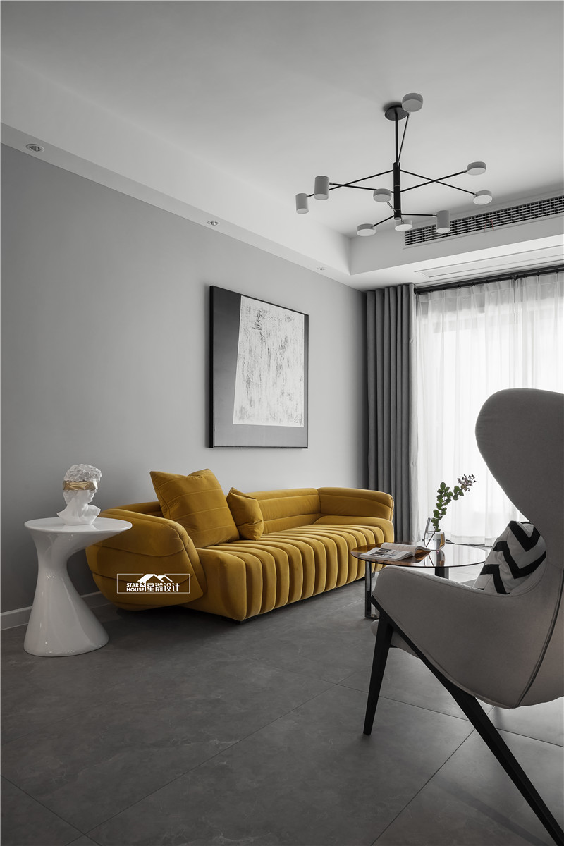 本案在设计处理手法上,运用灰的两种不同色度 穿插处里墙体界面。强化了空间形体的变化.。搭配柔黄明亮的软装和灯饰,所展示柔美的曲线,虚与实,刚与柔,明与暗,这些元素与墙体进行质感对比的同时,更加强了空间中的视觉层次。整个空间在近乎没有任何装饰符号与色彩的条件下进行设计,但看上去又并不觉单调或沉闷,正因为设计师更多地注重色彩的比例、材质的对比和极为微妙的冷暖关系。那或明或暗,令我们联想起的不正是相机的菲林和摄影的光影吗。
